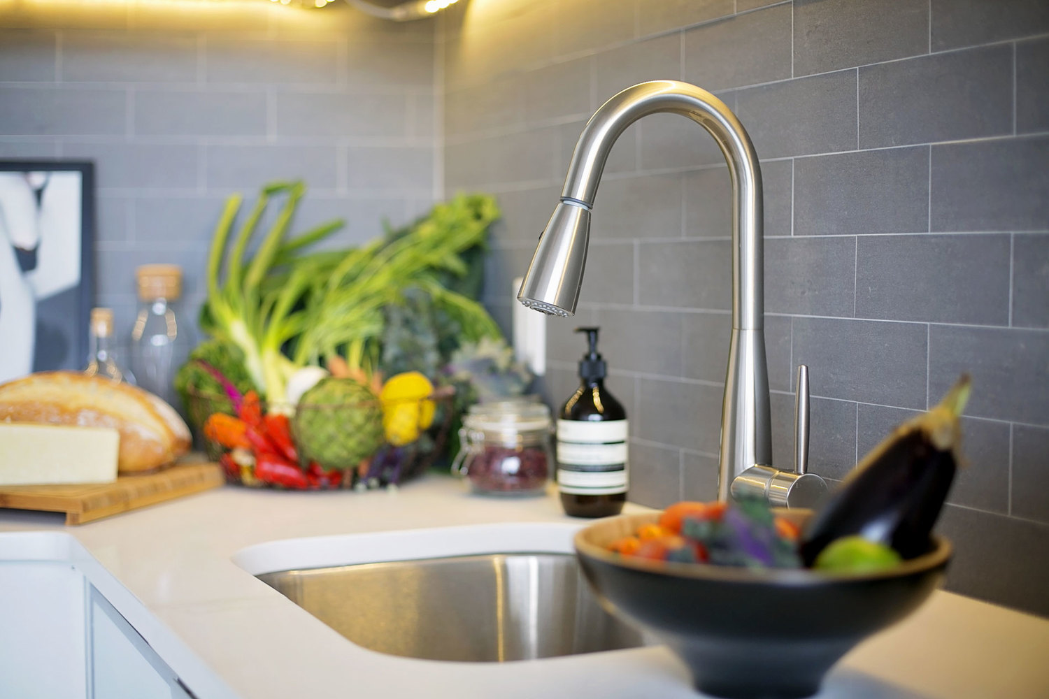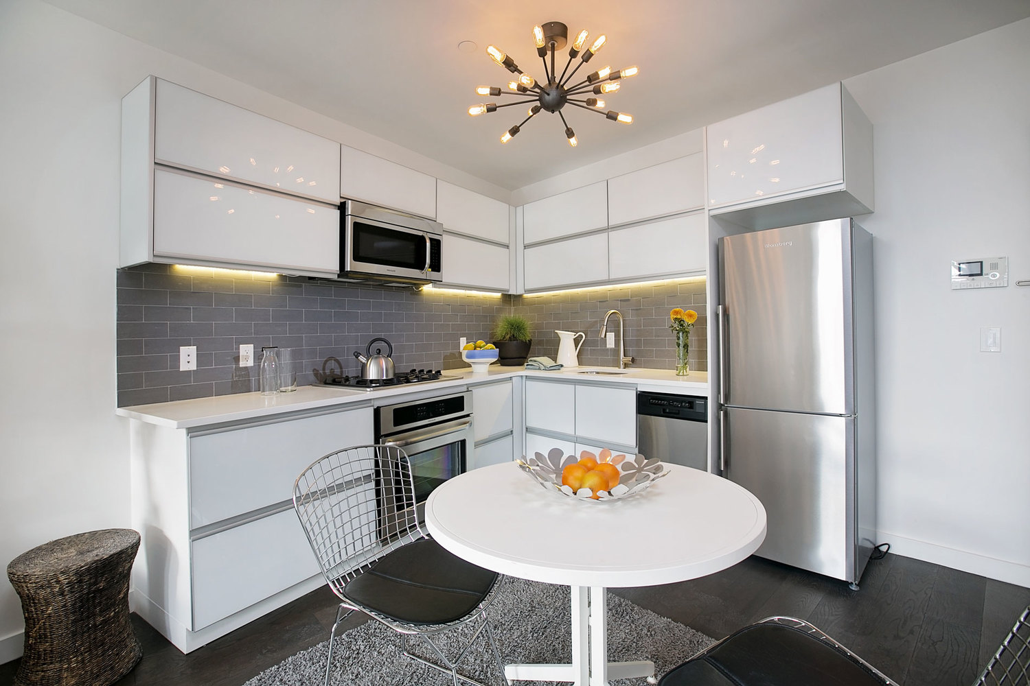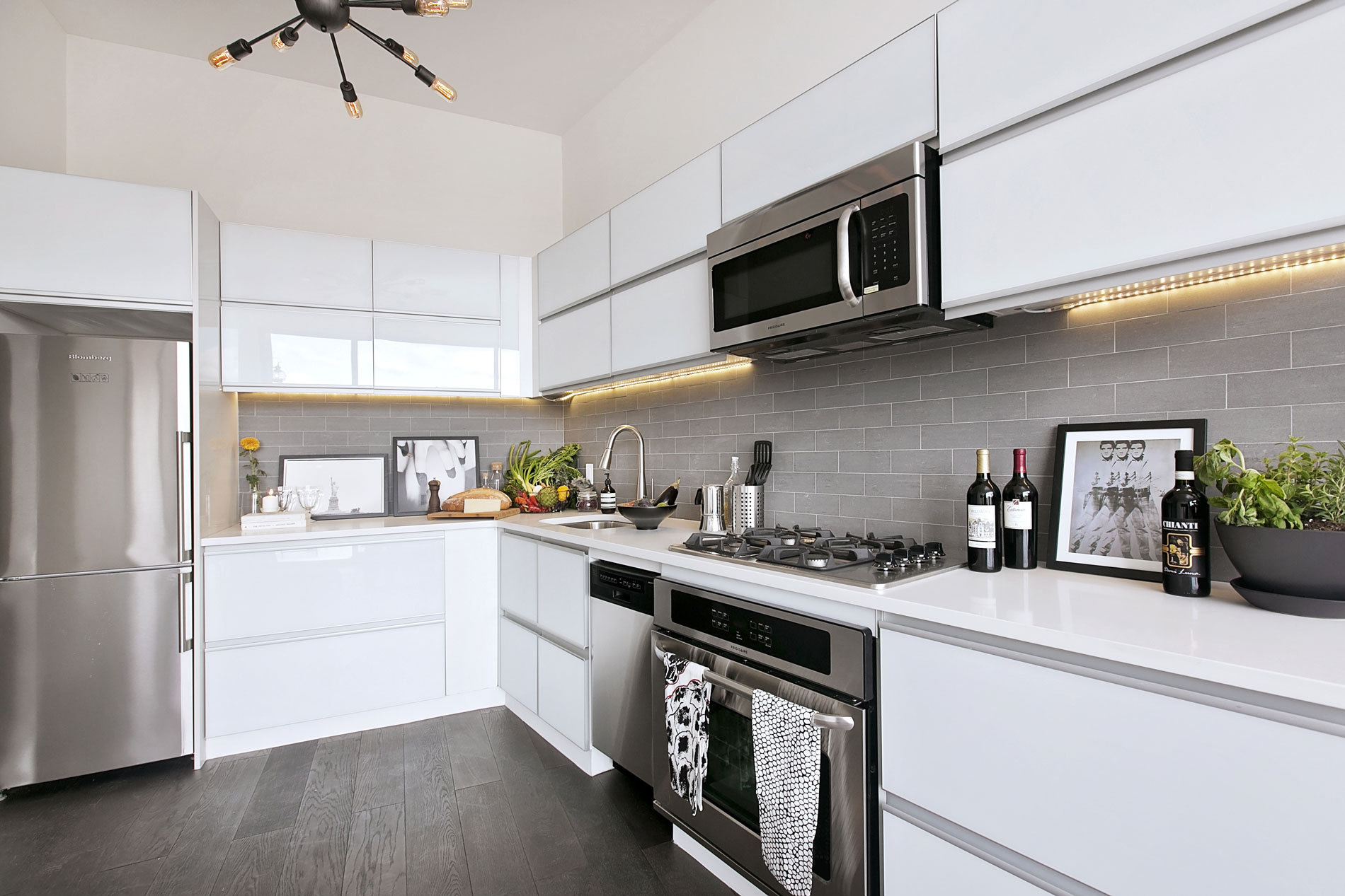 The kitchens are designed with sleek white cabinets, a gray stone back splash,