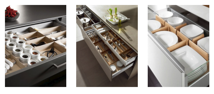 Modern stream-lined cabinetry with cabinet drawers can be built out with custom organizers